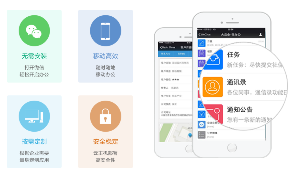 移動(dòng)辦公軟件是集客戶(hù)關(guān)系、日常辦公、財務(wù)、人力資源管理為一體的微信公眾平臺。充分發(fā)揮移動(dòng)設備的先天優(yōu)勢,比APP更輕盈,比PC版更便捷,移動(dòng)端搭載在微信企業(yè)號上,內部管理、服務(wù)移動(dòng)客戶(hù)、市場(chǎng)營(yíng)銷(xiāo)三合一。隨時(shí)、隨地、隨心實(shí)現智能辦公、營(yíng)銷(xiāo)全面覆蓋